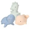 Um conjunto encantador que inclui três animais da savana feitos de borracha natural e uma prática bolsa de algodão orgânico, perfeita para guardar as figuras depois do banho.