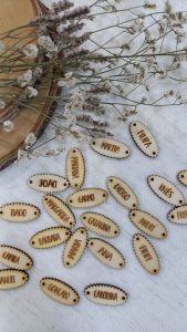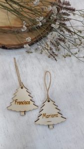 Chapas de madeira com nome – disponíveis em várias formas, como bolas, estrelas e árvores, ideais para decorar a árvore de Natal com um toque personalizado – mas também em pequenas chapas para personalizar todos os artigos dos mais pequenos.