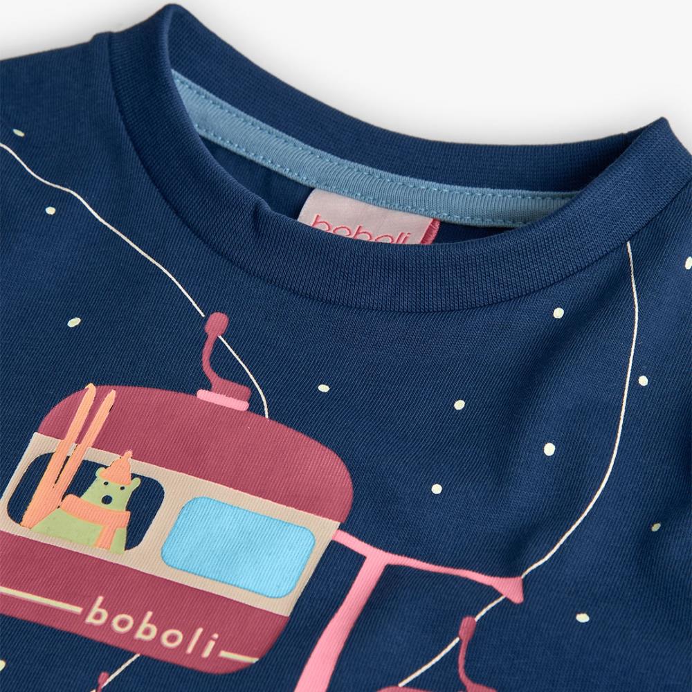 Sweatshirt de malha azul para menino destaca-se pelo seu encantador design de um teleférico numa paisagem nevada, que adiciona um toque divertido e moderno ao vestuário infantil.