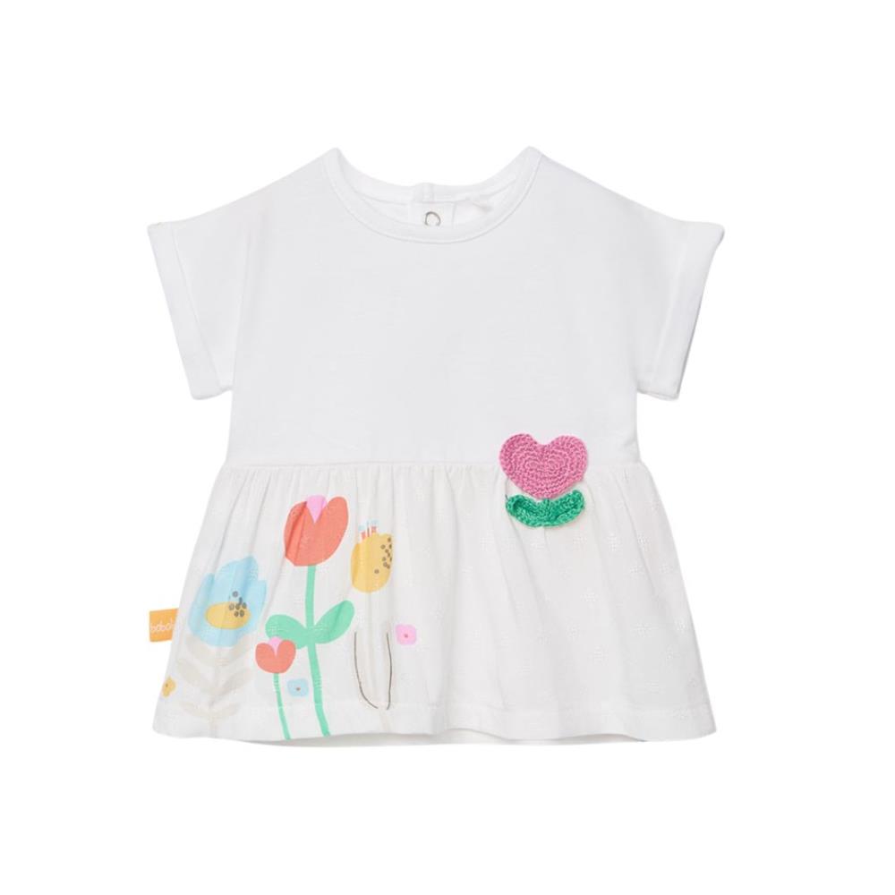 O design apresenta uma camisola branca que combina dois tecidos, com um estampado de flores e bordado em diferentes tons dando um toque alegre.