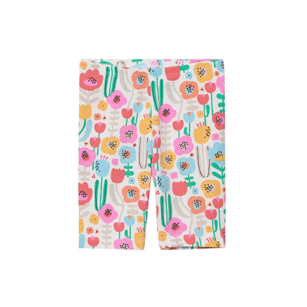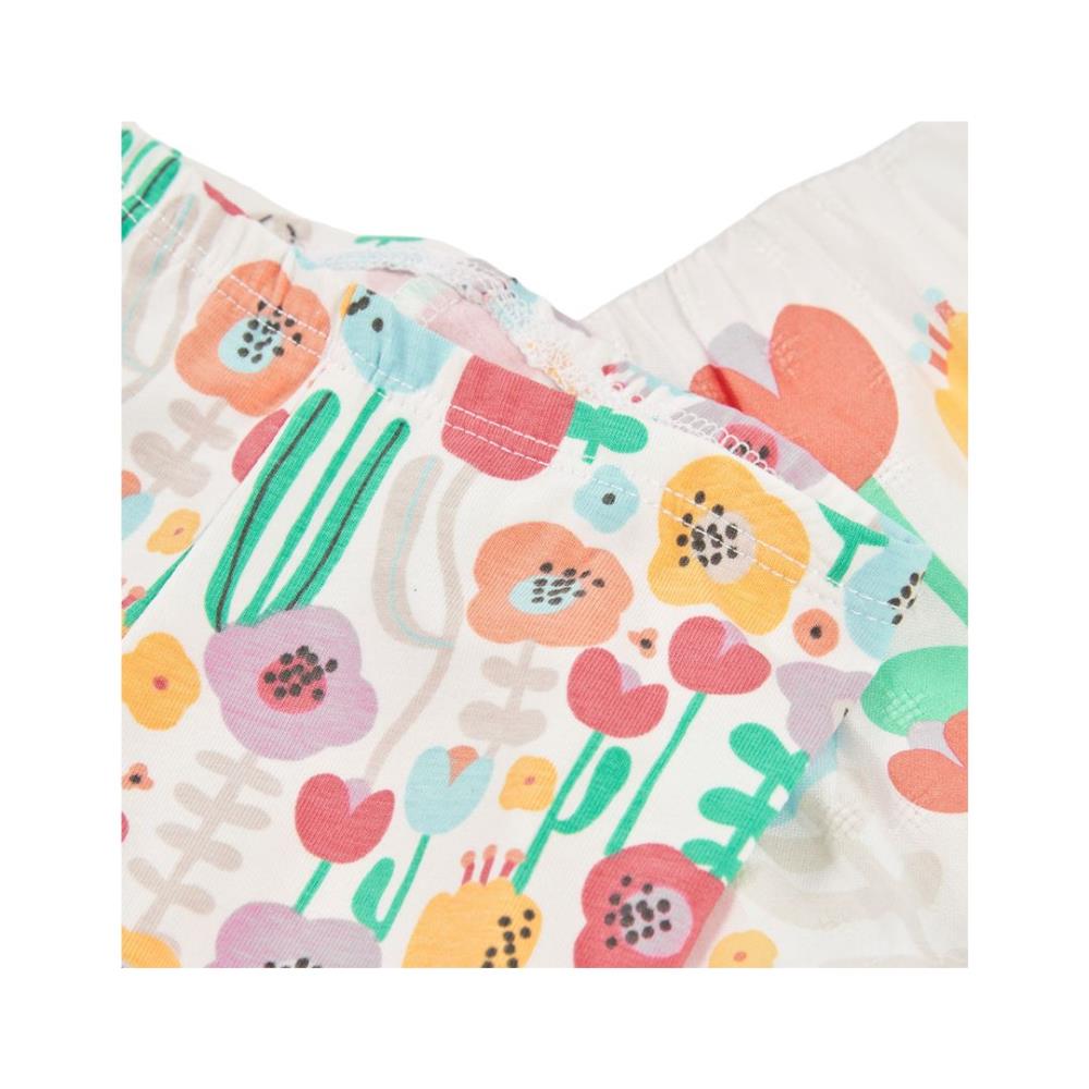 As calças de algodão elástico a condizer, também têm motivos florais, criando uma aparência coordenada e encantadora.