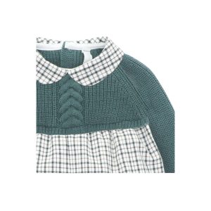 Conjunto para bebé com estrutura de pontos e linhas, detalhes de espiga e micro estampagem de xadrez com gola combinado, fibra de coco e pergaminho napa redondo, na cor verde.