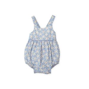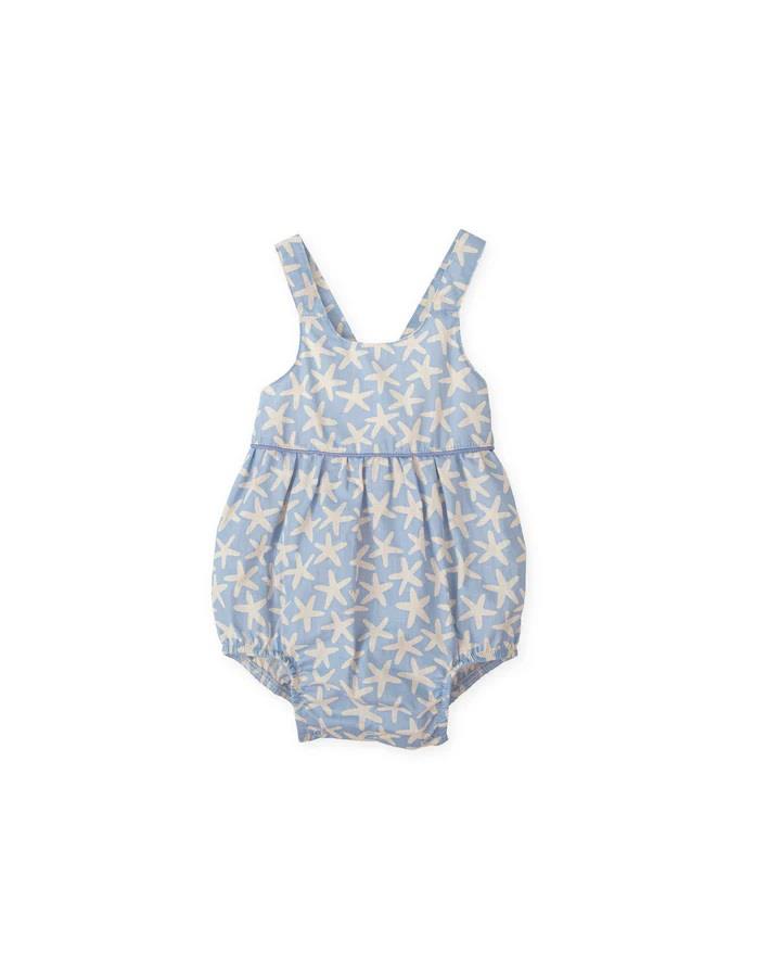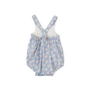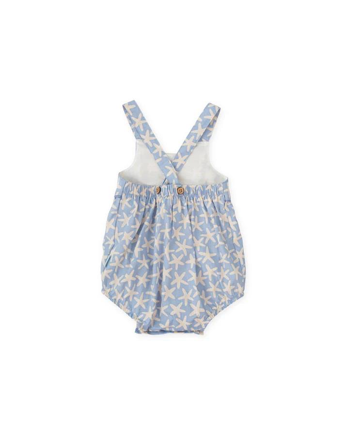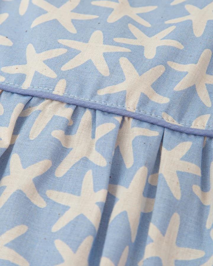 Fofo curto com alças em popeline azul com estampa de estrelas.