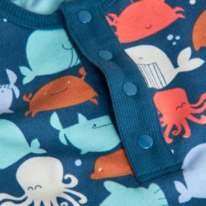 O seu tecido suave garante conforto durante todo o dia, enquanto a divertida estampa apresenta várias representações de animais marinhos.