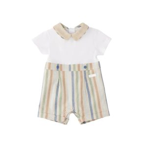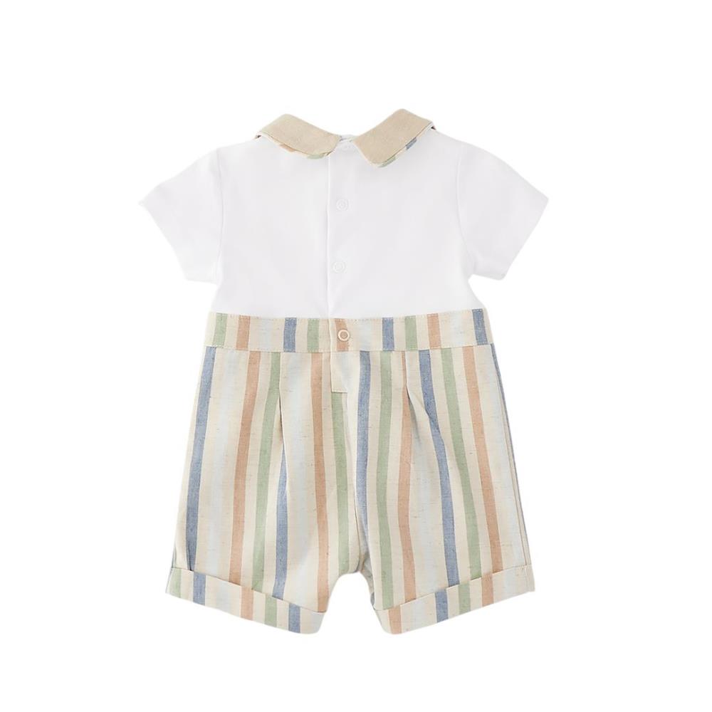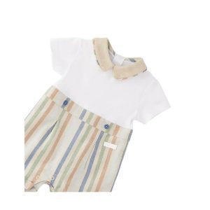 Macacão infantil Minibanda com blusa em malha e calça listrada em linho e algodão. Abertura com botões de pressão nas costas e na parte interna da perna.