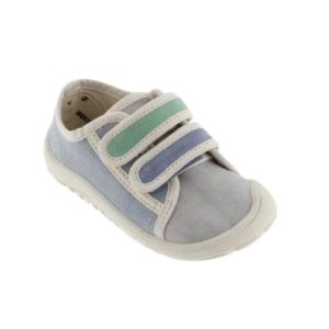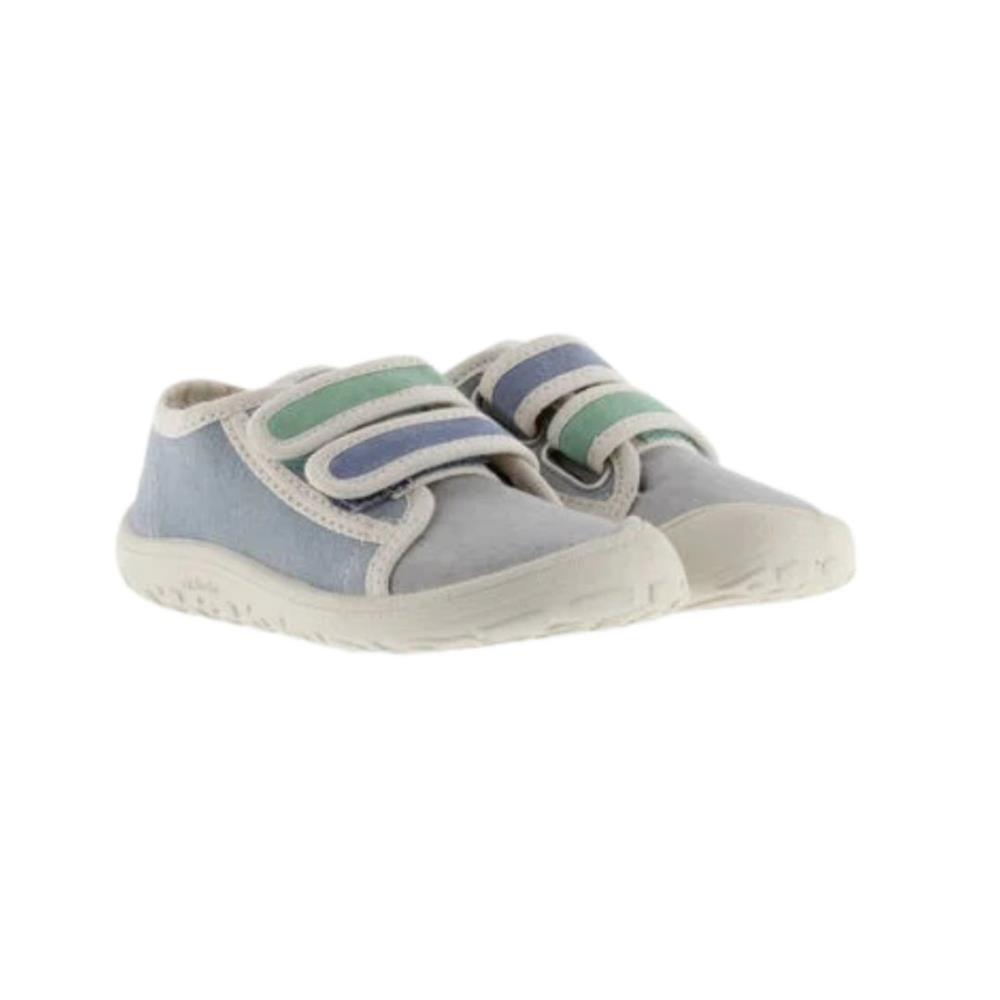 Ténis de lona barefoot para crianças fabricados em lona com debruns brancos.