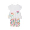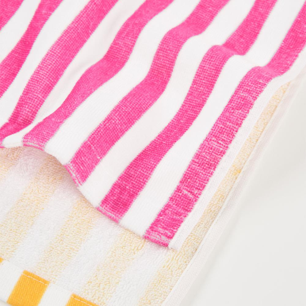 Apresenta um design de riscas em tons rosa e branco com desenhos coloridos de frutas que acrescentam um toque divertido.